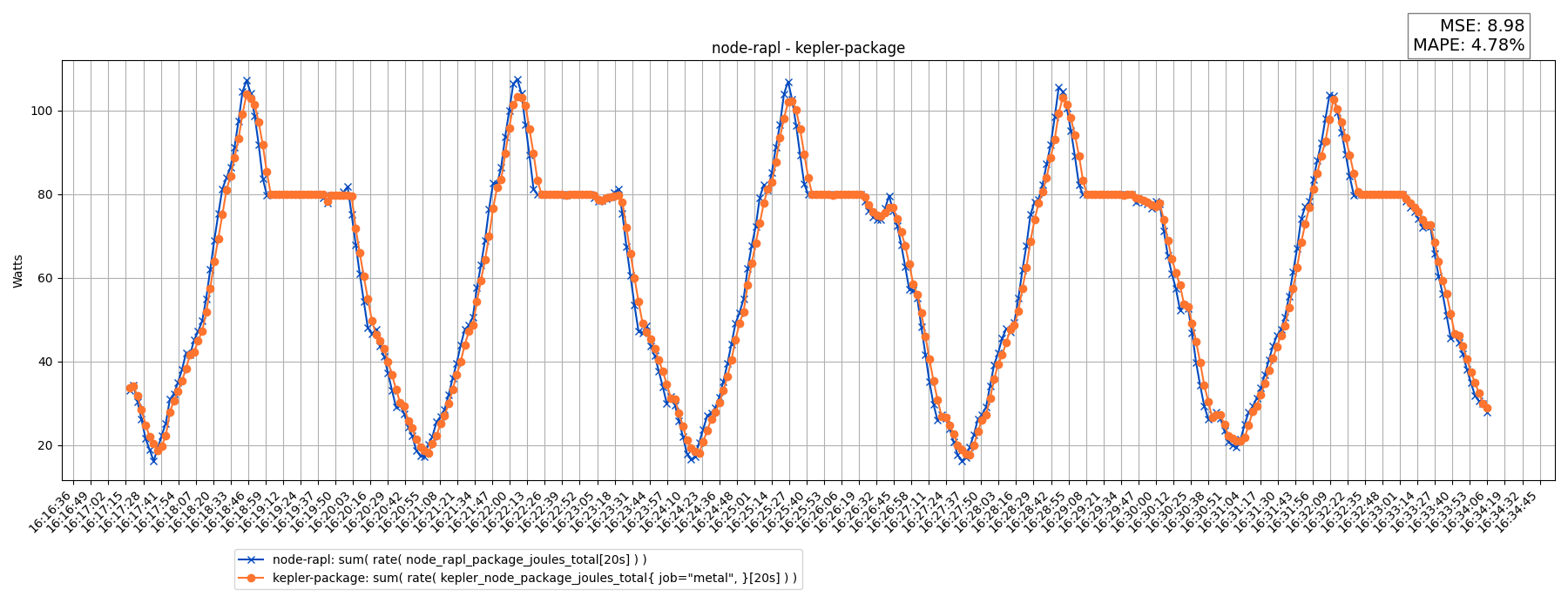 sum( rate( node_rapl_package_joules_total[20s] ) )sum( rate( kepler_node_package_joules_total{ job="metal", }[20s] ) )Results: