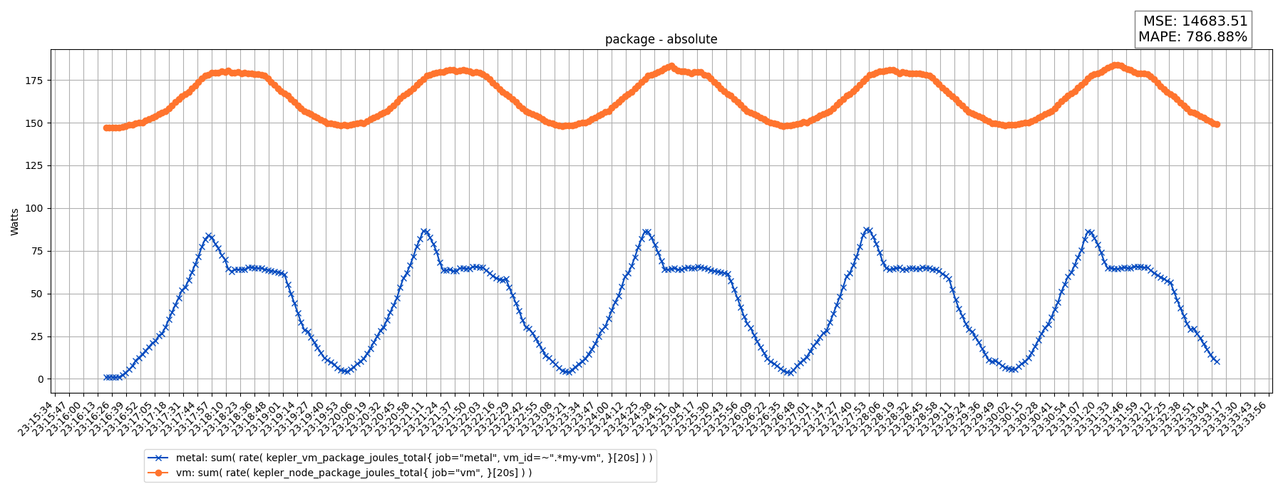 rate( kepler_vm_package_joules_total{ job="metal", vm_id=~".*my-vm", mode="idle", }[20s] )rate( kepler_node_package_joules_total{ job="vm", mode="idle", }[20s] )Results: