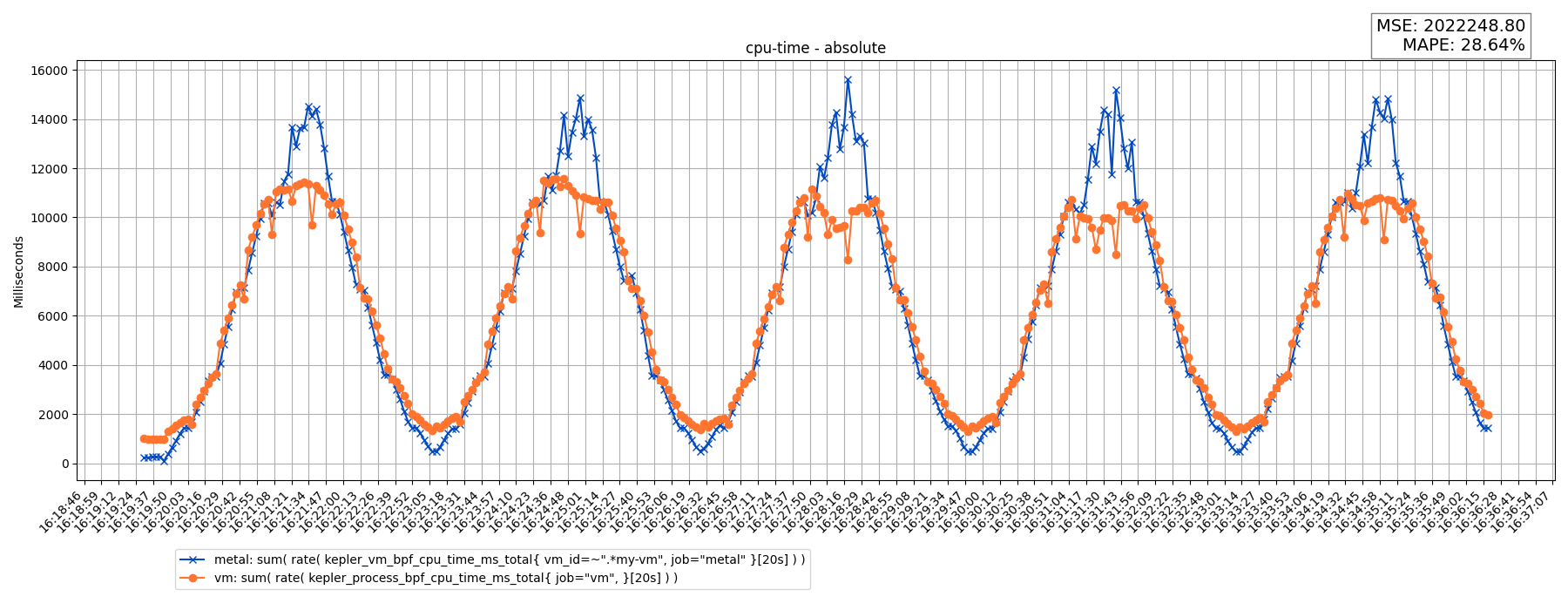 sum( rate( kepler_vm_bpf_cpu_time_ms_total{ vm_id=~".*my-vm", job="metal" }[20s] ) )sum( rate( kepler_process_bpf_cpu_time_ms_total{ job="vm", }[20s] ) )Results: