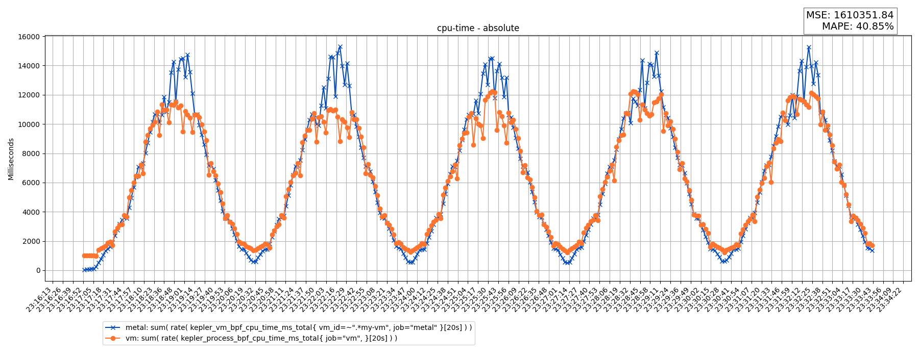 sum( rate( kepler_vm_bpf_cpu_time_ms_total{ vm_id=~".*my-vm", job="metal" }[20s] ) )sum( rate( kepler_process_bpf_cpu_time_ms_total{ job="vm", }[20s] ) )Results: