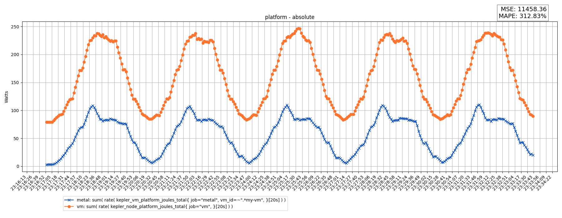 rate( kepler_vm_platform_joules_total{ job="metal", vm_id=~".*my-vm", mode="idle", }[20s] )rate( kepler_node_platform_joules_total{ job="vm", mode="idle", }[20s] )Results: