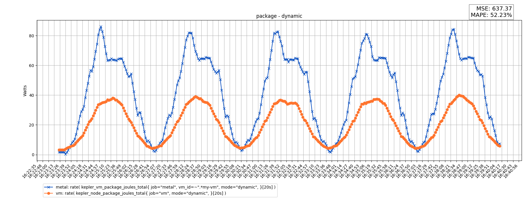 rate( kepler_vm_package_joules_total{ job="metal", vm_id=~".*my-vm", mode="dynamic", }[20s] )rate( kepler_node_package_joules_total{ job="vm", mode="dynamic", }[20s] )Results: