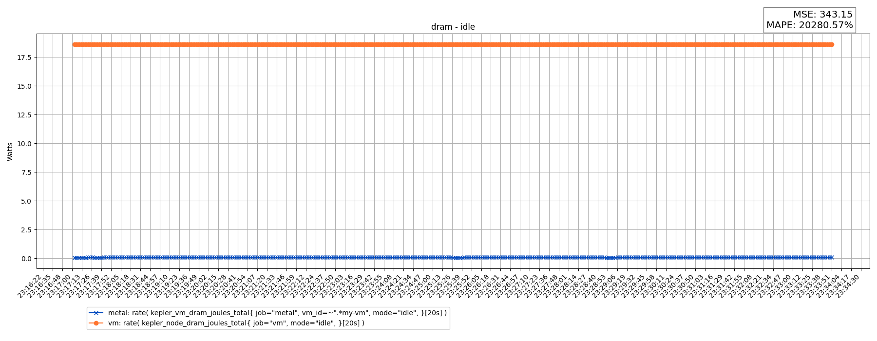 rate( kepler_vm_dram_joules_total{ job="metal", vm_id=~".*my-vm", mode="idle", }[20s] )rate( kepler_node_dram_joules_total{ job="vm", mode="idle", }[20s] )Results: