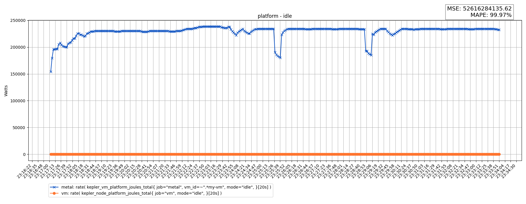 rate( kepler_vm_platform_joules_total{ job="metal", vm_id=~".*my-vm", mode="idle", }[20s] )rate( kepler_node_platform_joules_total{ job="vm", mode="idle", }[20s] )Results: