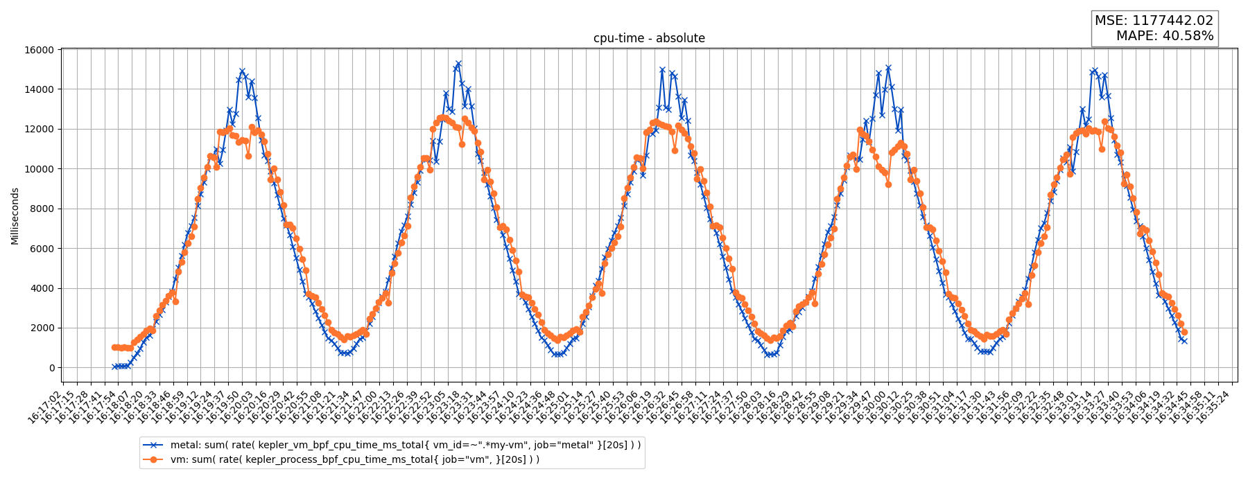 sum( rate( kepler_vm_bpf_cpu_time_ms_total{ vm_id=~".*my-vm", job="metal" }[20s] ) )sum( rate( kepler_process_bpf_cpu_time_ms_total{ job="vm", }[20s] ) )Results:
