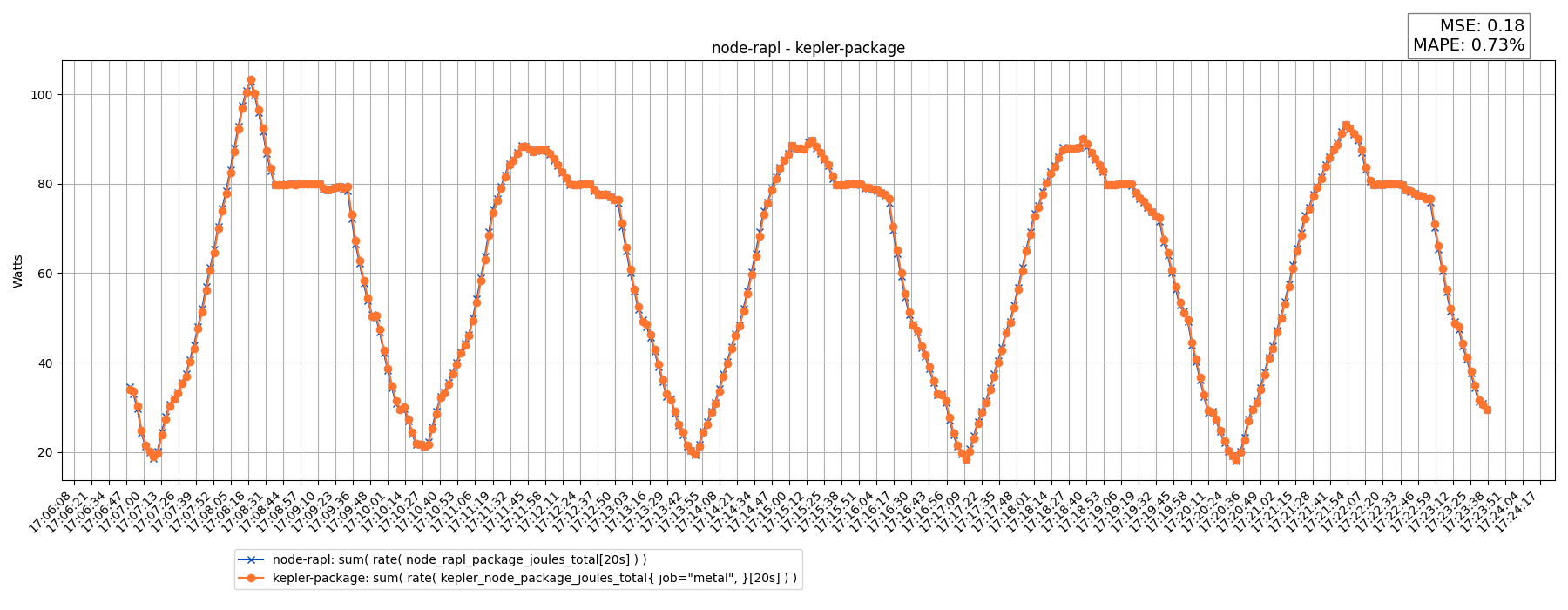 sum( rate( node_rapl_package_joules_total[20s] ) )sum( rate( kepler_node_package_joules_total{ job="metal", }[20s] ) )Results: