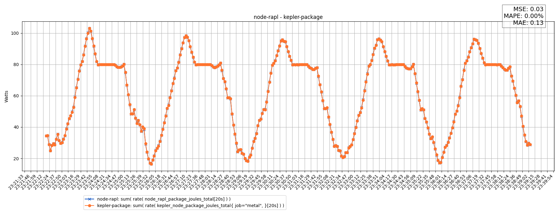 sum( rate( node_rapl_package_joules_total[20s] ) )sum( rate( kepler_node_package_joules_total{ job="metal", }[20s] ) )Results: