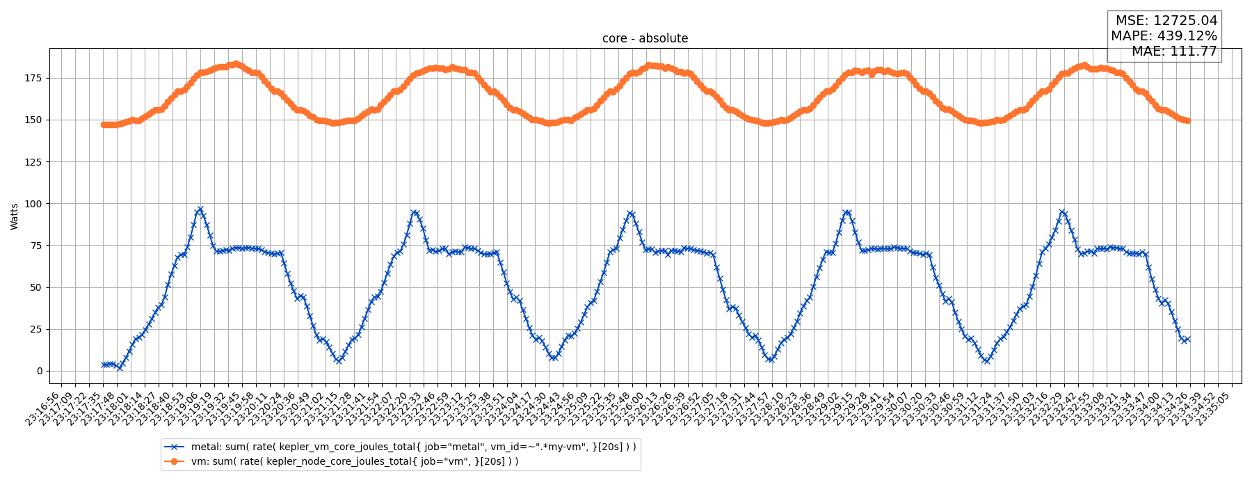 sum( rate( kepler_vm_core_joules_total{ job="metal", vm_id=~".*my-vm", }[20s] ) )sum( rate( kepler_node_core_joules_total{ job="vm", }[20s] ) )Results: