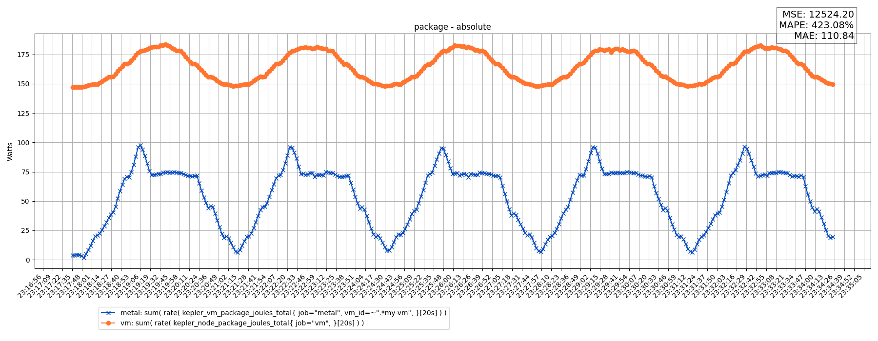rate( kepler_vm_package_joules_total{ job="metal", vm_id=~".*my-vm", mode="dynamic", }[20s] )rate( kepler_node_package_joules_total{ job="vm", mode="dynamic", }[20s] )Results: