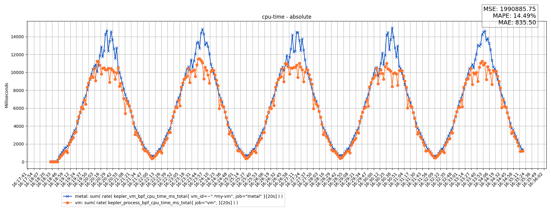 sum( rate( kepler_vm_bpf_cpu_time_ms_total{ vm_id=~".*my-vm", job="metal" }[20s] ) )sum( rate( kepler_process_bpf_cpu_time_ms_total{ job="vm", }[20s] ) )Results: