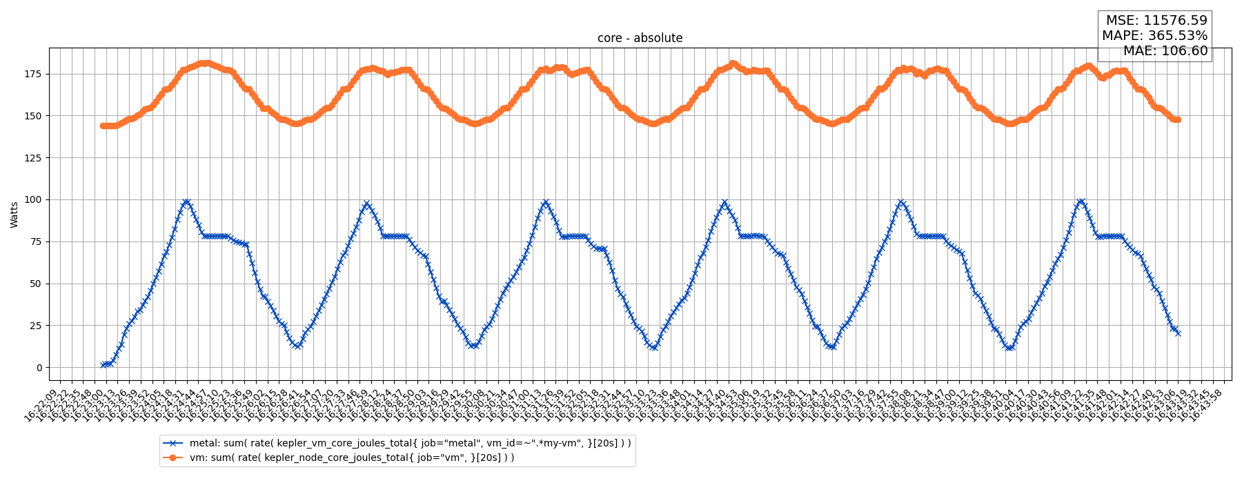 sum( rate( node_rapl_package_joules_total[20s] ) )sum( rate( kepler_node_package_joules_total{ job="metal", }[20s] ) )Results: