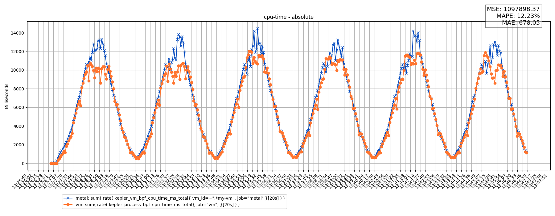 sum( rate( kepler_vm_bpf_cpu_time_ms_total{ vm_id=~".*my-vm", job="metal" }[20s] ) )sum( rate( kepler_process_bpf_cpu_time_ms_total{ job="vm", }[20s] ) )Results: