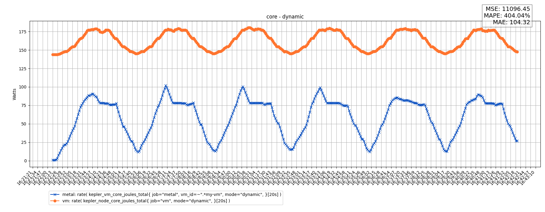 rate( kepler_vm_core_joules_total{ job="metal", vm_id=~".*my-vm", mode="dynamic", }[20s] )rate( kepler_node_core_joules_total{ job="vm", mode="dynamic", }[20s] )Results: