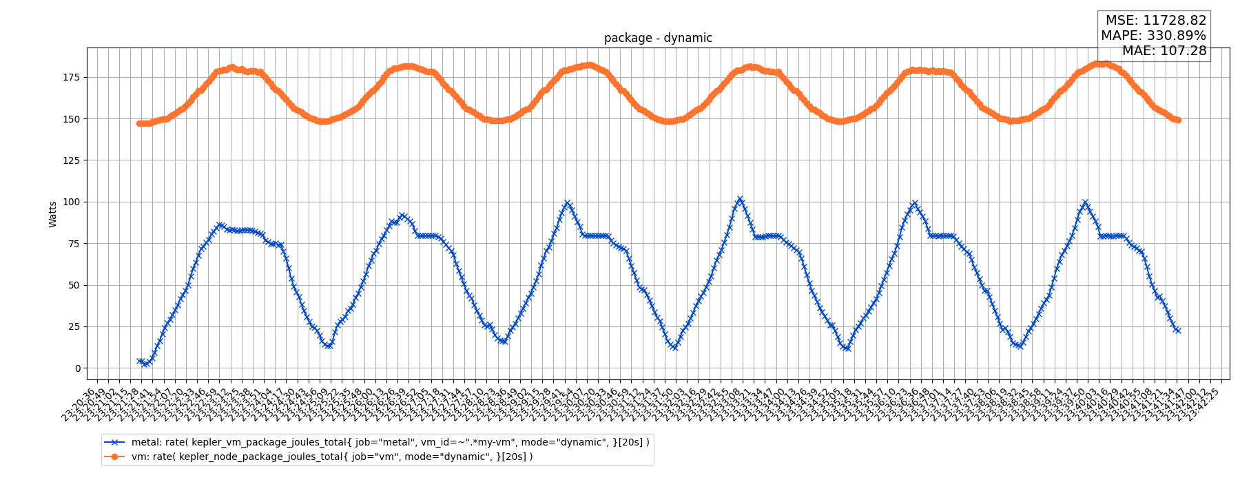 rate( kepler_vm_package_joules_total{ job="metal", vm_id=~".*my-vm", mode="dynamic", }[20s] )rate( kepler_node_package_joules_total{ job="vm", mode="dynamic", }[20s] )Results:
