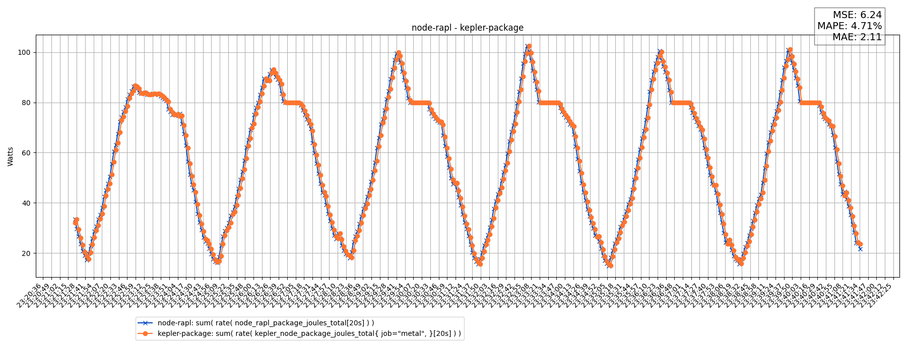 sum( rate( node_rapl_package_joules_total[20s] ) )sum( rate( kepler_node_package_joules_total{ job="metal", }[20s] ) )Results: