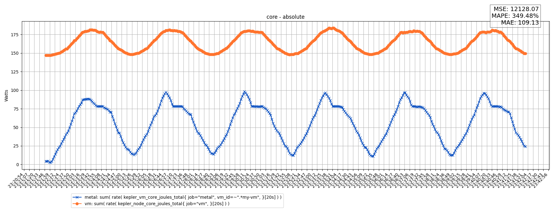 rate( kepler_vm_core_joules_total{ job="metal", vm_id=~".*my-vm", mode="dynamic", }[20s] )rate( kepler_node_core_joules_total{ job="vm", mode="dynamic", }[20s] )Results: