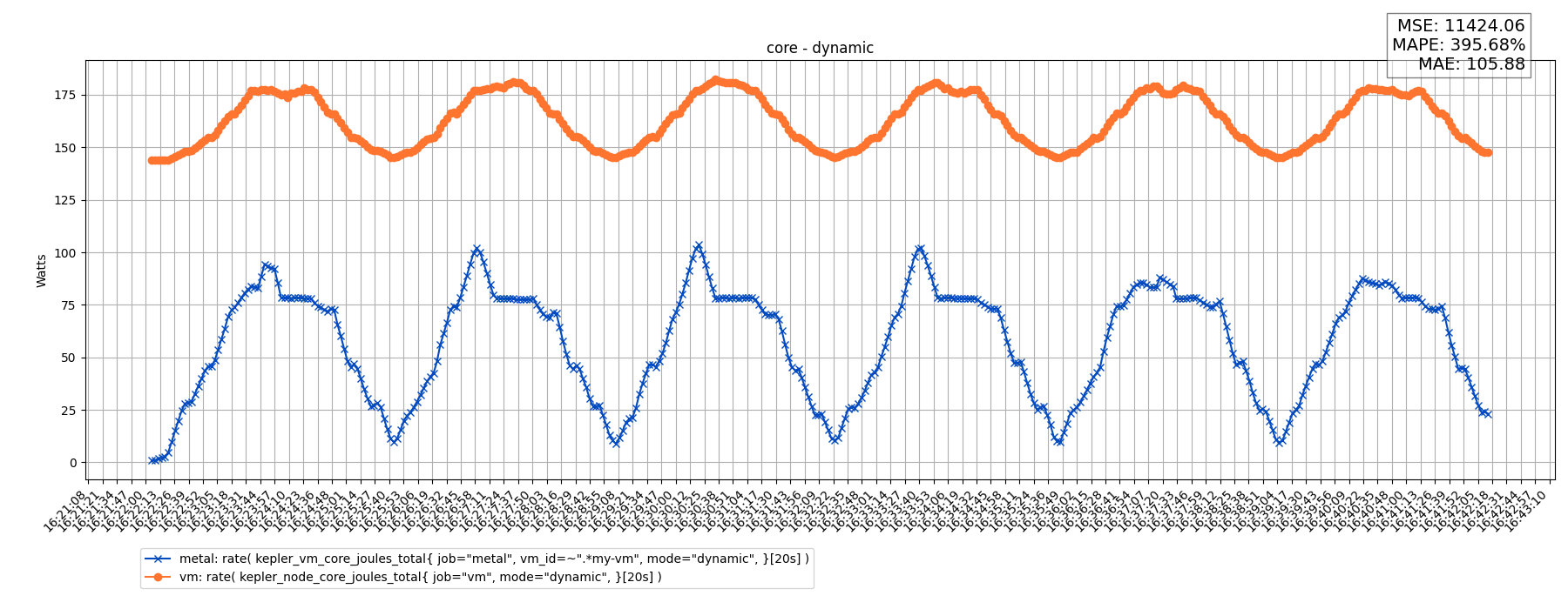 rate( kepler_vm_core_joules_total{ job="metal", vm_id=~".*my-vm", mode="dynamic", }[20s] )rate( kepler_node_core_joules_total{ job="vm", mode="dynamic", }[20s] )Results: