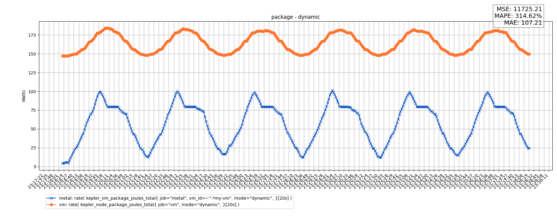 rate( kepler_vm_package_joules_total{ job="metal", vm_id=~".*my-vm", mode="dynamic", }[20s] )rate( kepler_node_package_joules_total{ job="vm", mode="dynamic", }[20s] )Results: