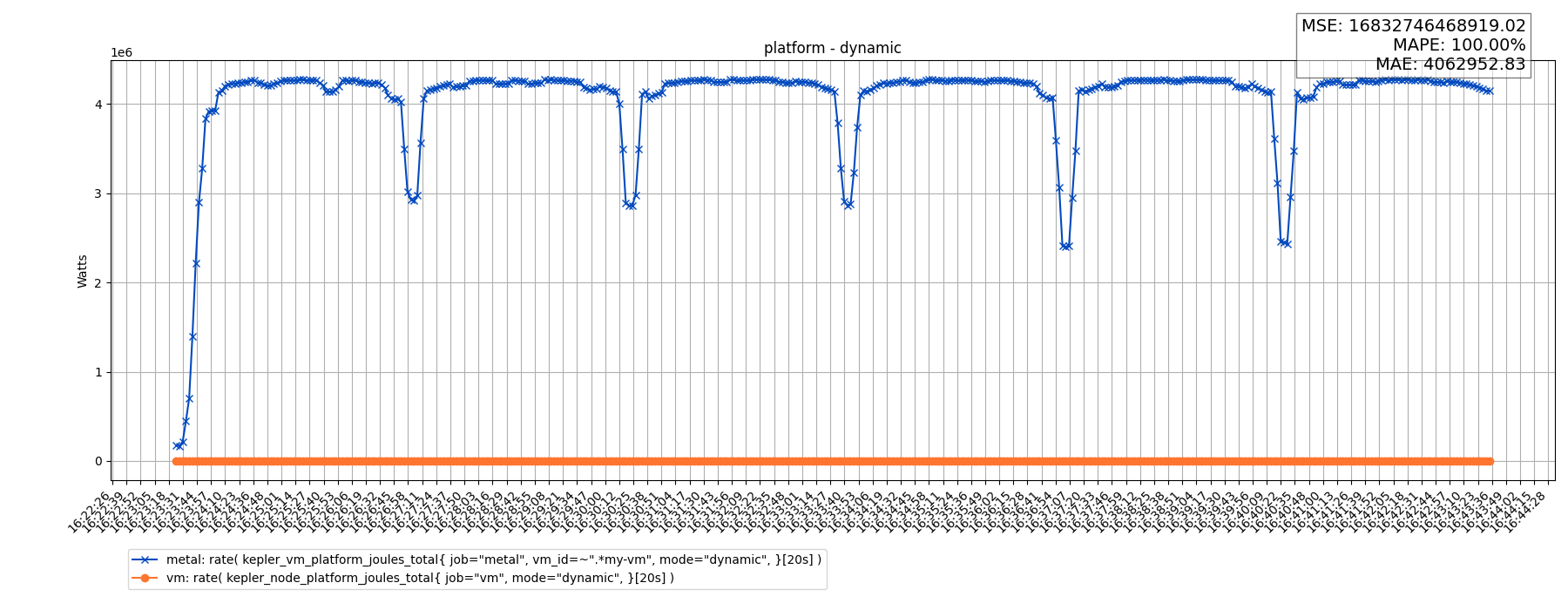 rate( kepler_vm_platform_joules_total{ job="metal", vm_id=~".*my-vm", mode="dynamic", }[20s] )rate( kepler_node_platform_joules_total{ job="vm", mode="dynamic", }[20s] )Results: