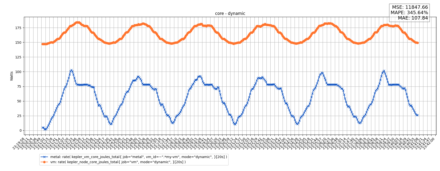 rate( kepler_vm_core_joules_total{ job="metal", vm_id=~".*my-vm", mode="dynamic", }[20s] )rate( kepler_node_core_joules_total{ job="vm", mode="dynamic", }[20s] )Results: