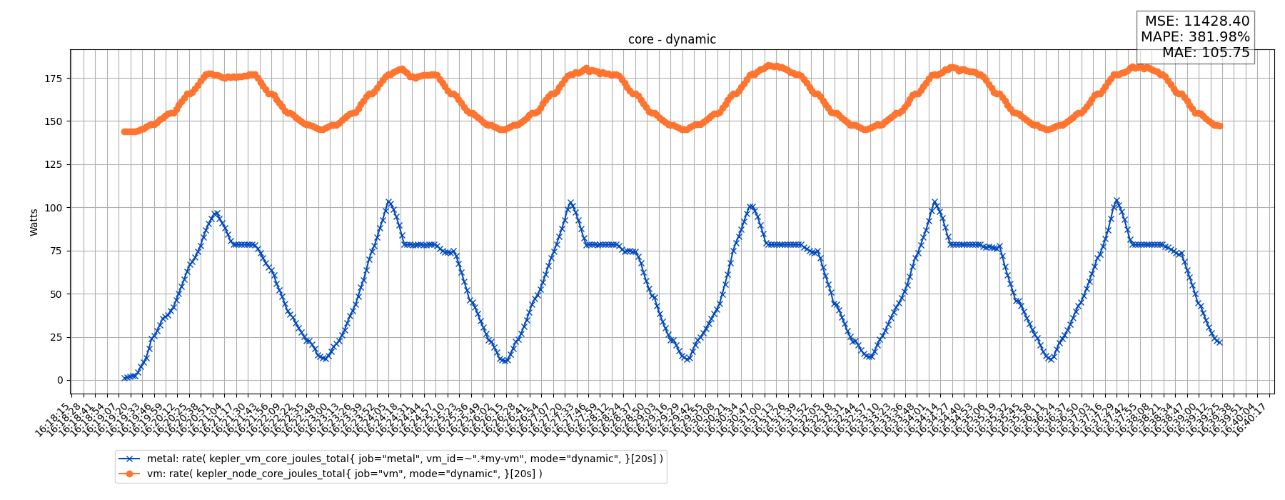 rate( kepler_vm_core_joules_total{ job="metal", vm_id=~".*my-vm", mode="dynamic", }[20s] )rate( kepler_node_core_joules_total{ job="vm", mode="dynamic", }[20s] )Results: