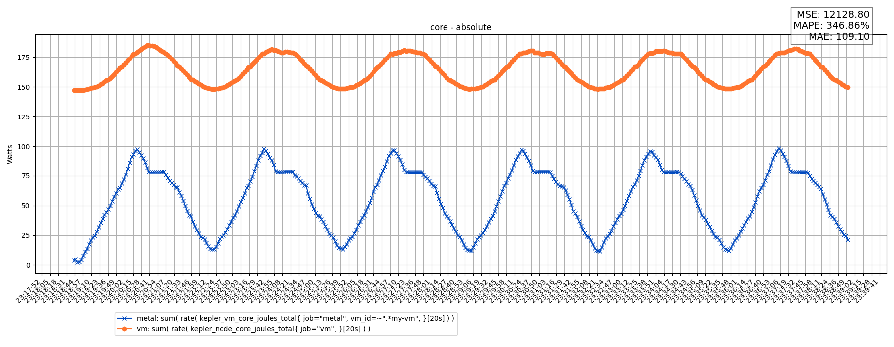 rate( kepler_vm_core_joules_total{ job="metal", vm_id=~".*my-vm", mode="dynamic", }[20s] )rate( kepler_node_core_joules_total{ job="vm", mode="dynamic", }[20s] )Results: