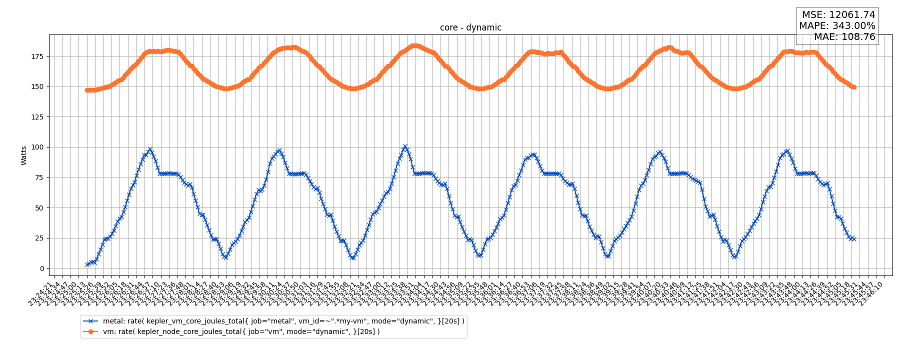 rate( kepler_vm_core_joules_total{ job="metal", vm_id=~".*my-vm", mode="dynamic", }[20s] )rate( kepler_node_core_joules_total{ job="vm", mode="dynamic", }[20s] )Results: