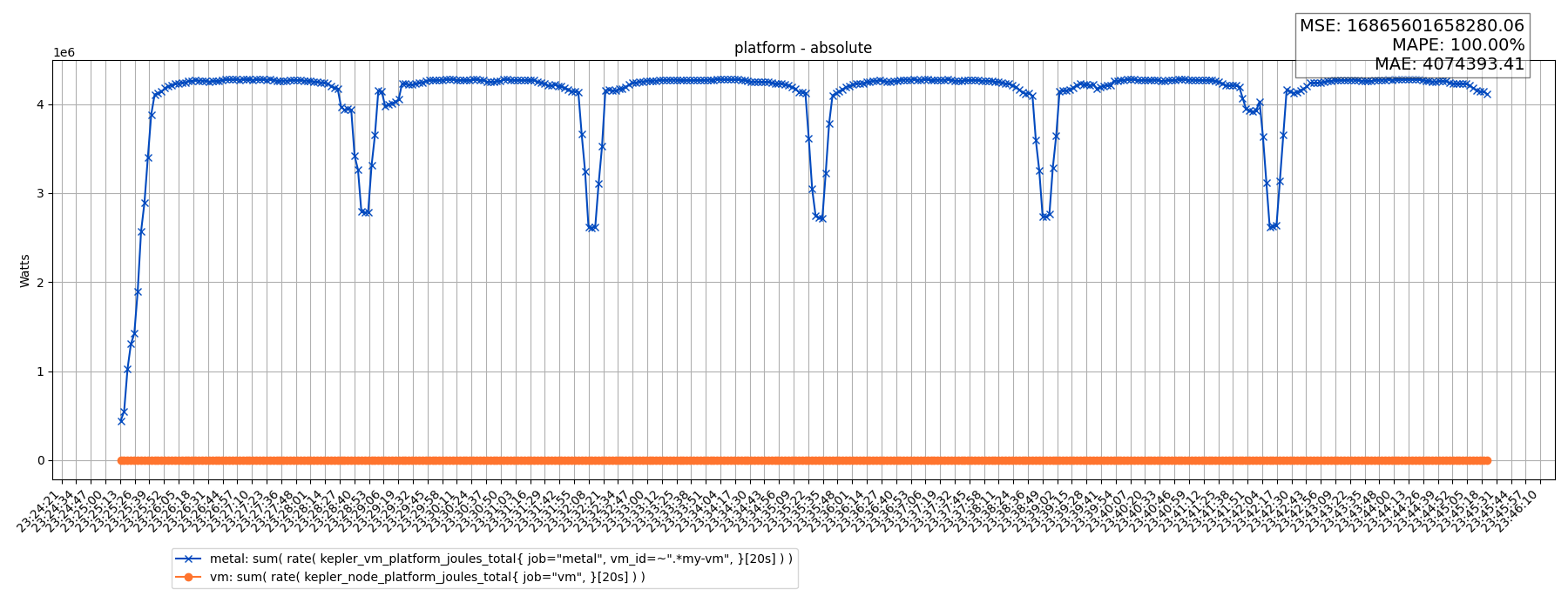 rate( kepler_vm_platform_joules_total{ job="metal", vm_id=~".*my-vm", mode="dynamic", }[20s] )rate( kepler_node_platform_joules_total{ job="vm", mode="dynamic", }[20s] )Results:
