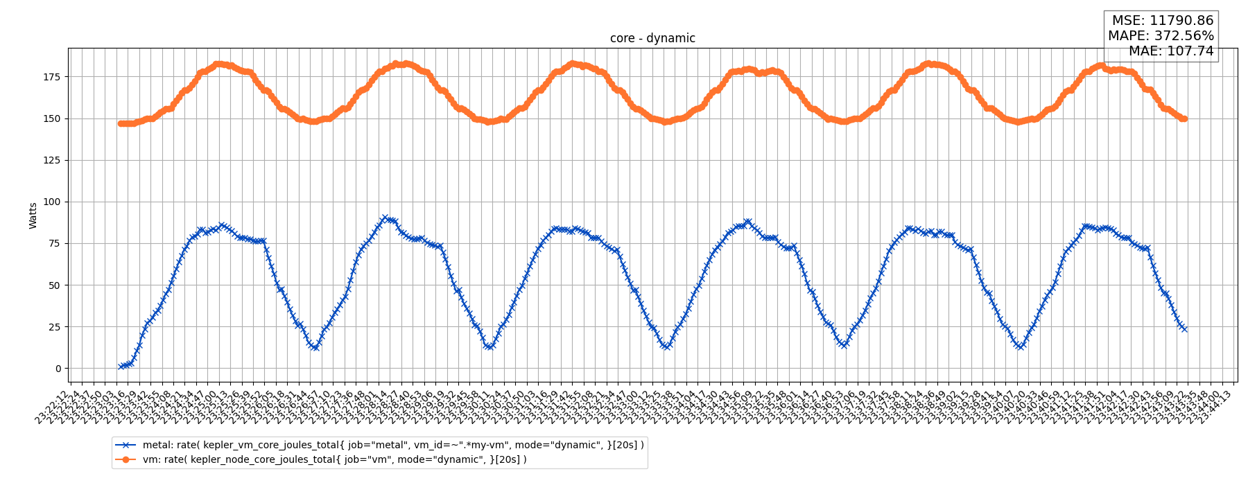 rate( kepler_vm_core_joules_total{ job="metal", vm_id=~".*my-vm", mode="dynamic", }[20s] )rate( kepler_node_core_joules_total{ job="vm", mode="dynamic", }[20s] )Results: