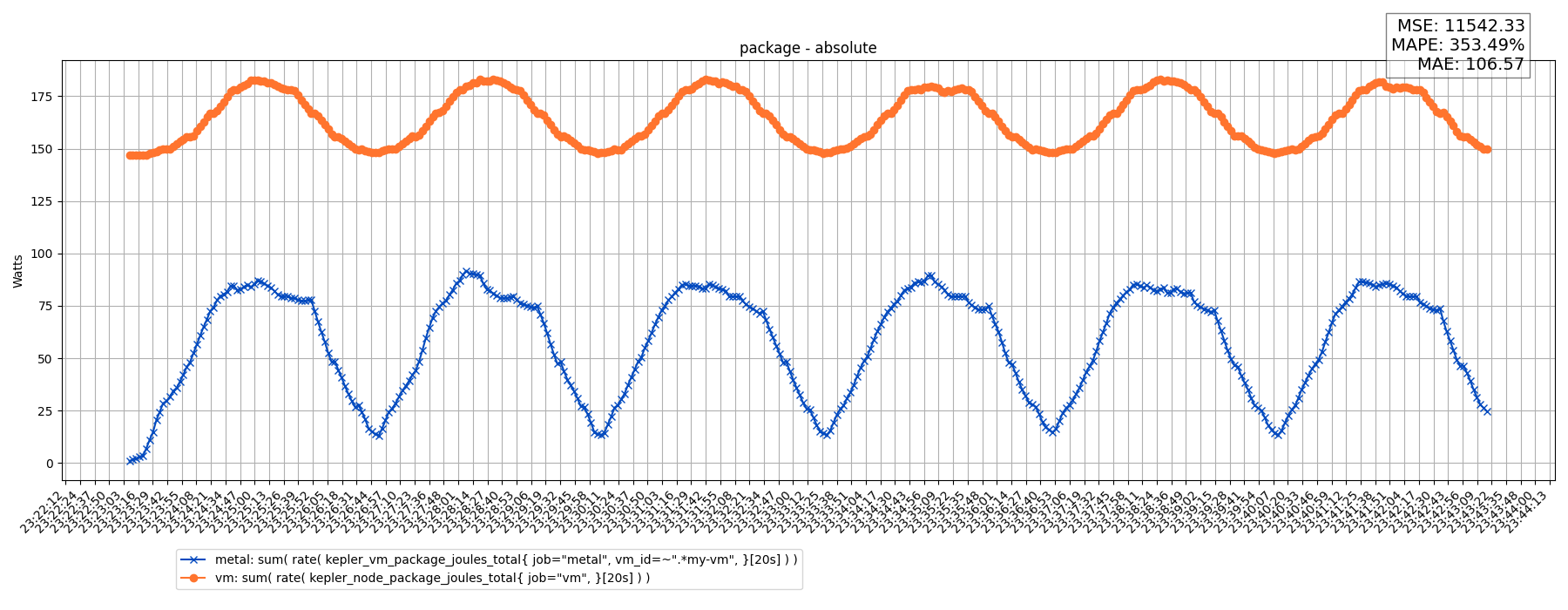 rate( kepler_vm_package_joules_total{ job="metal", vm_id=~".*my-vm", mode="dynamic", }[20s] )rate( kepler_node_package_joules_total{ job="vm", mode="dynamic", }[20s] )Results:
