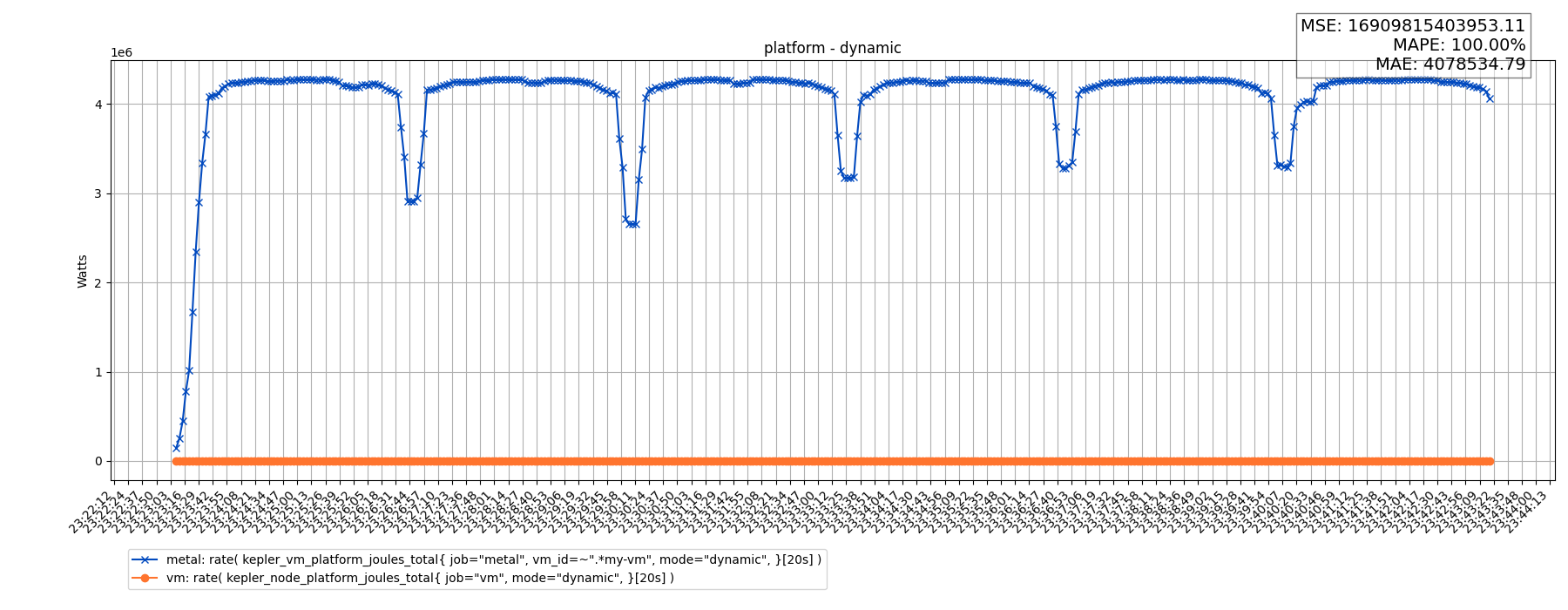 rate( kepler_vm_platform_joules_total{ job="metal", vm_id=~".*my-vm", mode="dynamic", }[20s] )rate( kepler_node_platform_joules_total{ job="vm", mode="dynamic", }[20s] )Results: