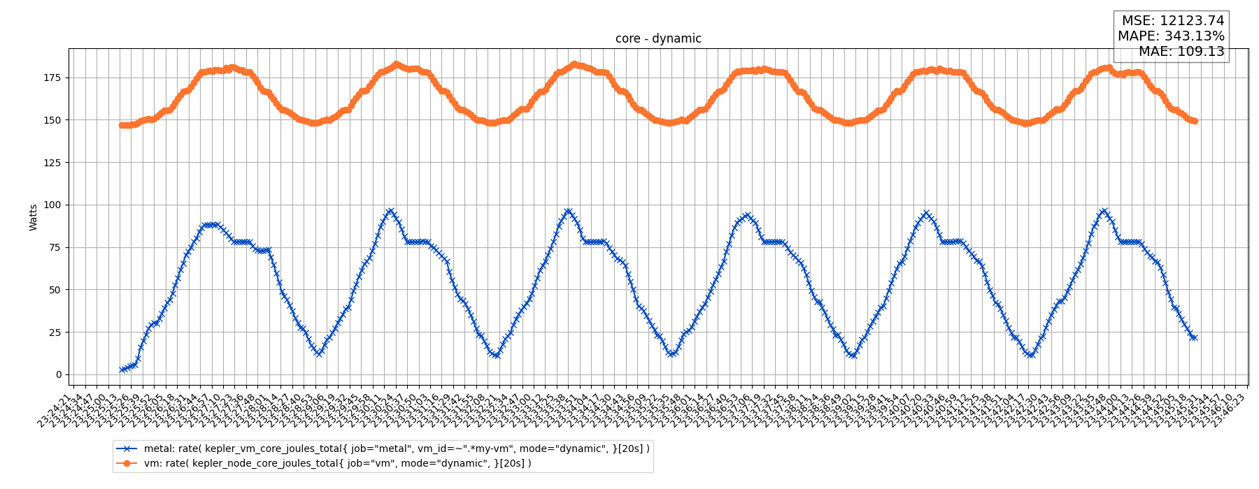 rate( kepler_vm_core_joules_total{ job="metal", vm_id=~".*my-vm", mode="dynamic", }[20s] )rate( kepler_node_core_joules_total{ job="vm", mode="dynamic", }[20s] )Results: