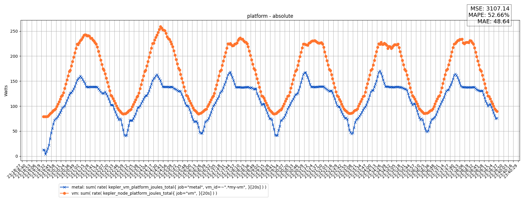 sum( rate( node_rapl_package_joules_total[20s] ) )sum( rate( kepler_node_package_joules_total{ job="metal", }[20s] ) )Results: