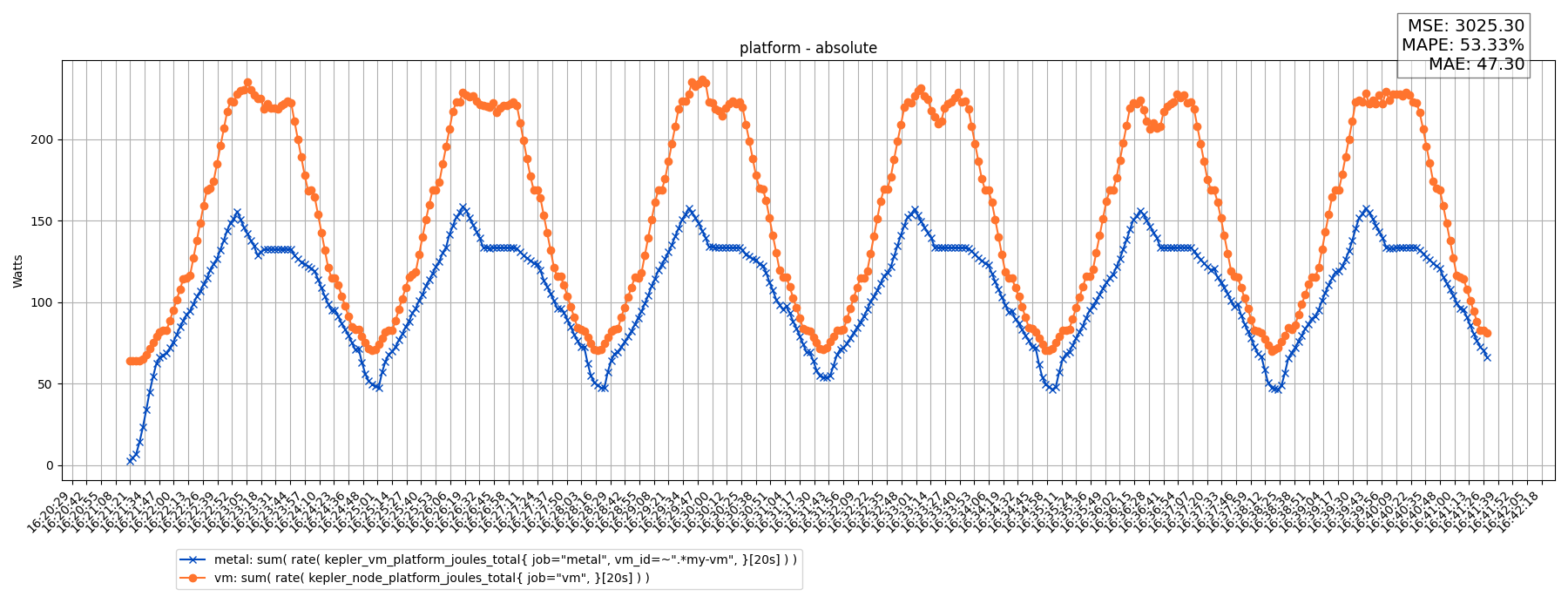 sum( rate( node_rapl_package_joules_total[20s] ) )sum( rate( kepler_node_package_joules_total{ job="metal", }[20s] ) )Results: