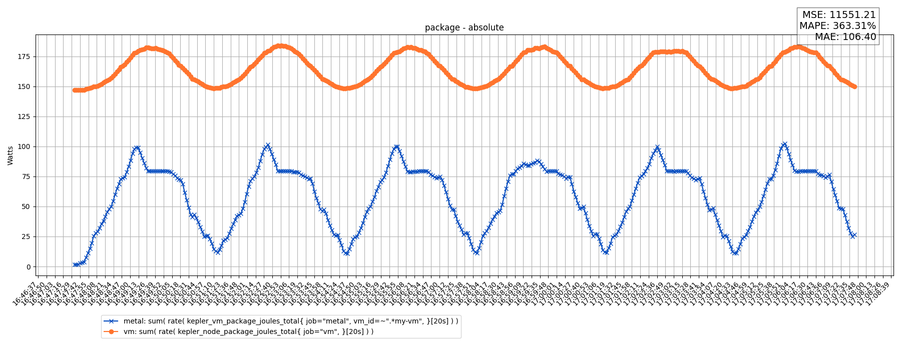 rate( kepler_vm_package_joules_total{ job="metal", vm_id=~".*my-vm", mode="dynamic", }[20s] )rate( kepler_node_package_joules_total{ job="vm", mode="dynamic", }[20s] )Results: