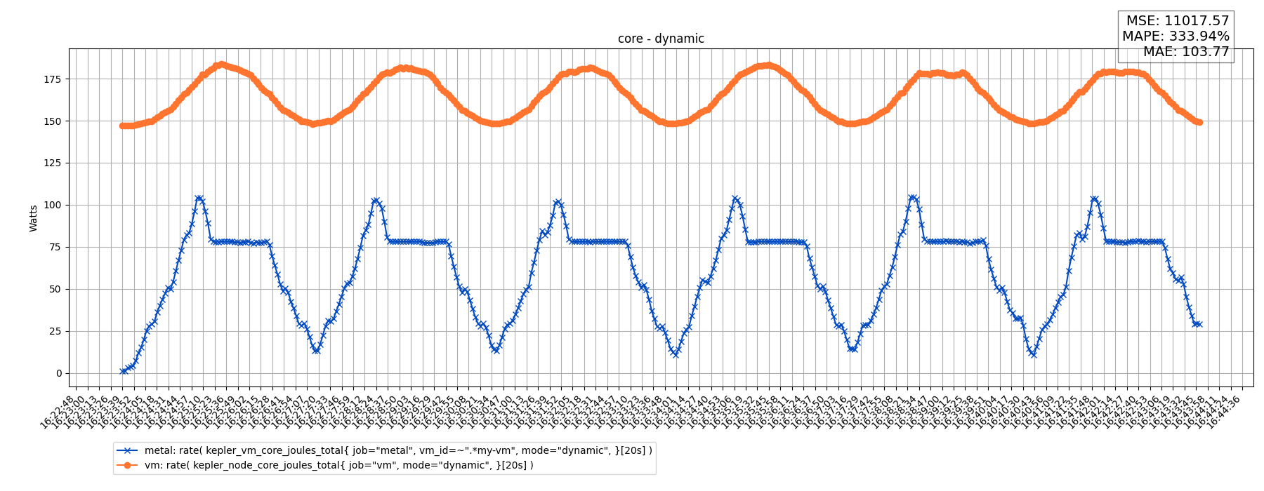 rate( kepler_vm_core_joules_total{ job="metal", vm_id=~".*my-vm", mode="dynamic", }[20s] )rate( kepler_node_core_joules_total{ job="vm", mode="dynamic", }[20s] )Results: