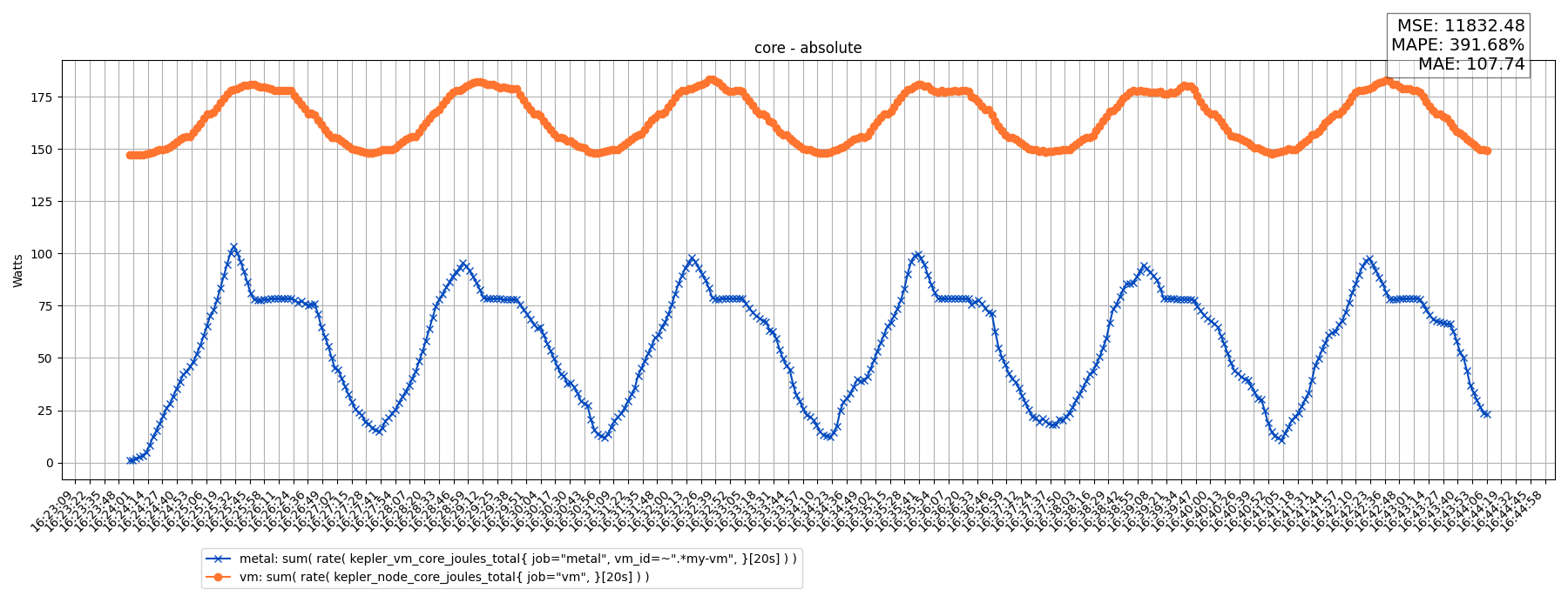 rate( kepler_vm_core_joules_total{ job="metal", vm_id=~".*my-vm", mode="dynamic", }[20s] )rate( kepler_node_core_joules_total{ job="vm", mode="dynamic", }[20s] )Results: