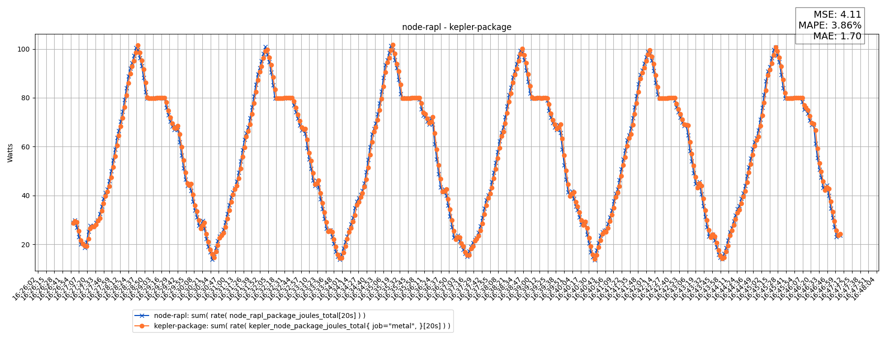 sum( rate( node_rapl_package_joules_total[20s] ) )sum( rate( kepler_node_package_joules_total{ job="metal", }[20s] ) )Results: