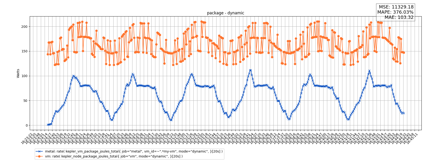 rate( kepler_vm_package_joules_total{ job="metal", vm_id=~".*my-vm", mode="dynamic", }[20s] )rate( kepler_node_package_joules_total{ job="vm", mode="dynamic", }[20s] )Results: